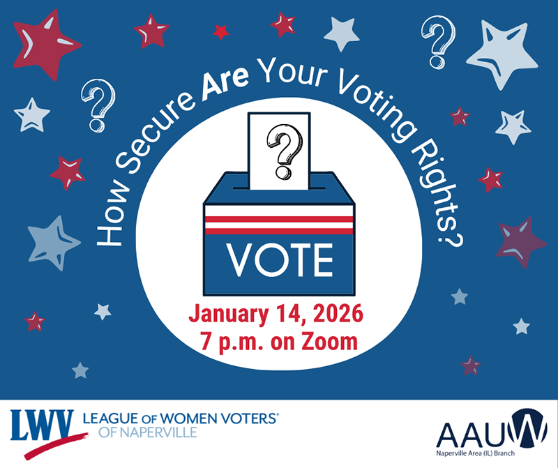 Red, white and blue illustration of a voting ballot box with a ballot with a question mark; title "How Secure Are Your Voting Rights?"; January 14, 2026, 7 p.m. on Zoom; League of Women Voters of Naperville and AAUW Naperville Area (IL) Branch logosCurrent pending legislation such as the SAVE Act (Safeguard American Voter Eligibility Act), executive orders, and court cases could negatively impact your ability to vote. Join AAUW Naperville Area and League of Women Voters of Naperville for a timely community webinar on Wednesday, January 14, at 7 PM. Our panel of experts will share the possible effects and what can be done to counter these measures.