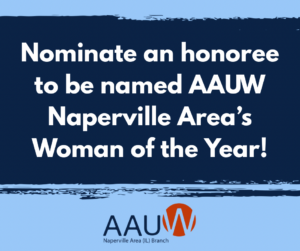 AAUW Naperville Area is now accepting nominations for its 2026 Woman of the Year. This award recognizes a Naperville area woman who has demonstrated an exceptional level of leadership and community service; and has supported the advancement of equity for women and girls. The awardee will be honored at the AAUW Naperville Area spring awards event on May 2, 2026.